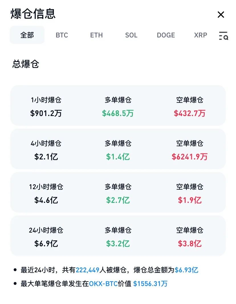 CoinGlass数据显示,过去24小时加密货币全网爆仓金额达6.9亿美元。其中,空单保持3.8亿美元,多单爆仓3.2亿美元。