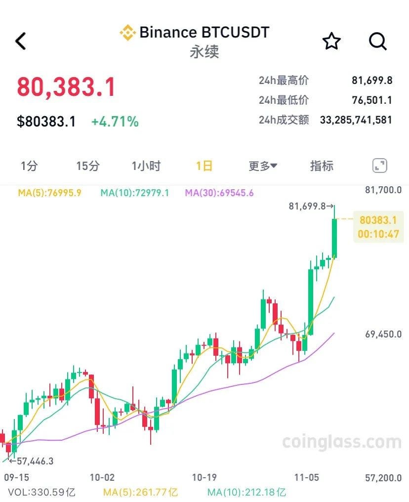 自上周以来,比特币现货价格涨势如虹。北京时间11月10日,比特币站上8万美元关口,最高触及81699.8美元/枚,再度创下历史新高。截至记者发稿时,比特币价格回落至8万美元一线日以来,比特币累计涨幅约15%。