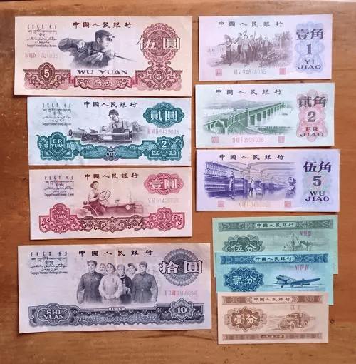 第三套人民币:1962年,第三套人民币发行。与之前两套不同,第三套人民币大力推广了防伪技术,增加了金属材料的应用,首次引入了1角、2角、5角的硬币。